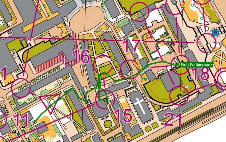 Na najdłuższej trasie Profesjonalistów najszybszy okazał się Piotr Łobodziński, który dystans 4.6km pokonał w ciągu 17 minut i 8 sekund. 2. miejsce przypadło Kamilowi Ancowi, który zakończył bieg ze startą 1'11, natomiast na 3. miejscu uplasował się Dmitro Terpai ze startą 2'32. Przez większą część trasy prowadzenie należało do Piotrka Parfianowicza, który przybiegł na metę z fenomenalnym czasem 15'18, natomiast okazało się, że ominął na swojej trasie 17PK, co oznaczało dyskwalifikację i tym samym zwycięstwo przeszło mu tuż koło nosa. Ominięcie punktu przez Piotrka możemy dobrze zobaczyć na powtórce z transmisji GPS poniżej. Dodatkowo warto zauważyć, że popełnił również 15-sekundowy błąd biegnąc na 15PK, ponieważ pobiegł najpierw w kierunku 16PK, z którego musiał się wrócić na 15PK i z powrotem na 16PK. Jak widać nawet najlepsi popełniają błędy, a dzięki śledzeniu GPS nic nie umknie naszej uwadze.