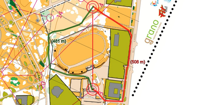 Otwarty i półotwarty teren zawodów pozwolił zawodnikom osiągać duże prędkości, więc budowniczy trasy (Jacek Morawski) starał się utrudnić im życie na różne sposoby. Stojaki (bez lampionów) poukrywane w gęstych żywopłotach, prawie zawsze niewidoczne od strony nabiegu skutecznie utrudniały wejście na punkt. Dodatkowo, punkty stojące na podobnych obiektach w bliskiej odległości od siebie spowodowały, że większa niż zazwyczaj liczba uczestników została nieklasyfikowana, z powodu niesprawdzenia kodu przed podbiciem. Mamy nadzieję, że zmotywuje Was to do zwracania uwagi na te niezwykle ważne aspekty techniczne w biegu sprinterskim ;)