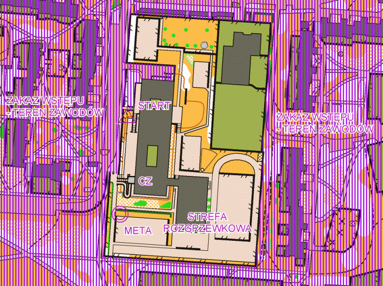 Przypominamy! Ważna informacja dla wszystkich osób biegających jest jeszcze taka, że w terenie występują w kilku miejscach pewne obiekty (schody z tarasami), które zostały na mapie oznaczone w sposób nietypowy. Problem jest w tym, że są to w większości obiekty, których sforsowanie poza wyznaczonymi wejściami jest niemożliwe, a z drugiej strony można pod nimi przejść. Aby zapewnić lepszą czytelność mapy zastosowano w tych przypadkach symbol mostku, jednak prosimy o traktowanie ich jako obiektu nie do przejścia. Wygląda to w terenie i na mapie następująco:
