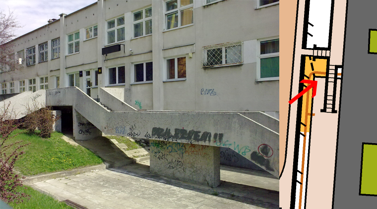 Przypominamy! Ważna informacja dla wszystkich osób biegających jest jeszcze taka, że w terenie występują w kilku miejscach pewne obiekty (schody z tarasami), które zostały na mapie oznaczone w sposób nietypowy. Problem jest w tym, że są to w większości obiekty, których sforsowanie poza wyznaczonymi wejściami jest niemożliwe, a z drugiej strony można pod nimi przejść. Aby zapewnić lepszą czytelność mapy zastosowano w tych przypadkach symbol mostku, jednak prosimy o traktowanie ich jako obiektu nie do przejścia. Wygląda to w terenie i na mapie następująco: